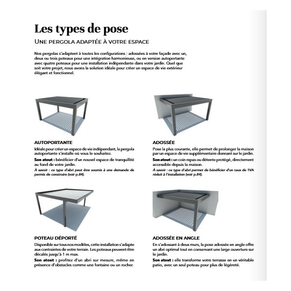 Types de pose : autoportante, adossée, adossée en angle